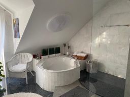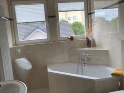 Das Bad im Obergeschoss lässt keine Wünsche offen.
